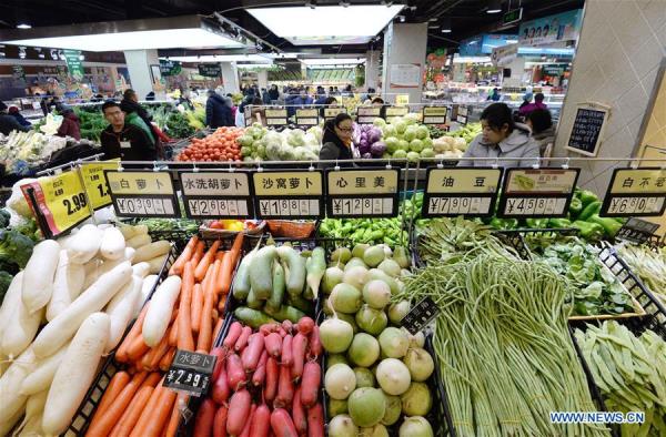 Customers select vegetables at a supermarket in Handan, north China's Hebei Province, Dec. 9, 2018. China's consumer price index (CPI), a main gauge of inflation, rose 2.2 percent year on year in November, down from 2.5 percent in October, the National Bureau of Statistics (NBS) said Sunday.