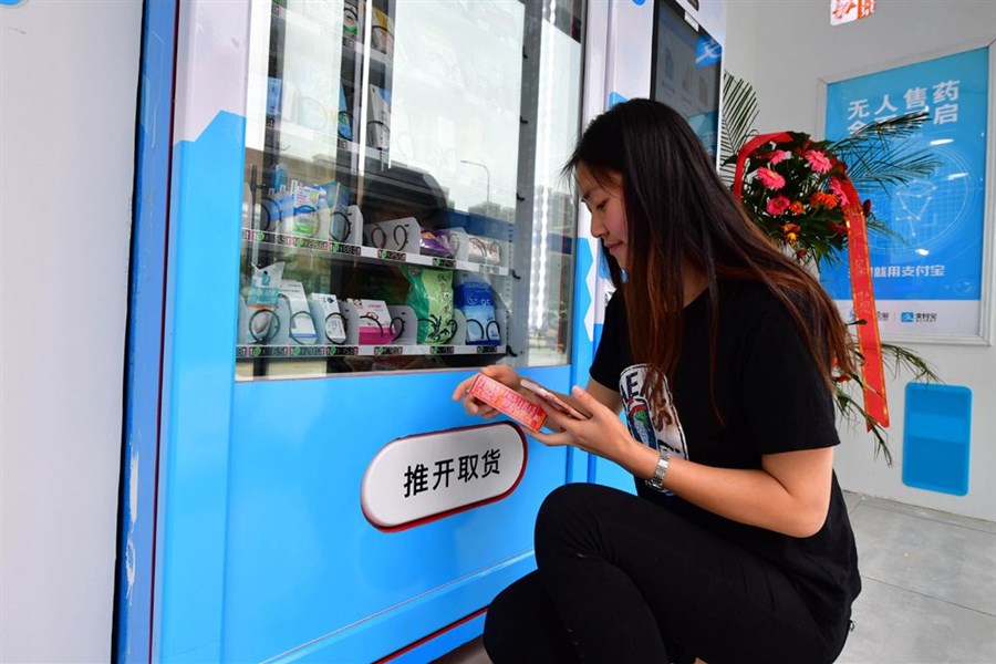 A shopper uses a self-service machine to buy drugs at a “future drugstore” in Zhengzhou, capital of central China’s Henan Province, yesterday.