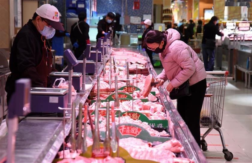 A consumer(R) selects meat at a supermarket in Handan, north China's Hebei Province, April 10, 2020. China's consumer price index (CPI), the main gauge of inflation, grew 4.3 percent year on year last month, moderating from 5.2 percent in February as economic activities including transport and logistics gradually recovered after effective epidemic containment in the country, according to data from the National Bureau of Statistics.